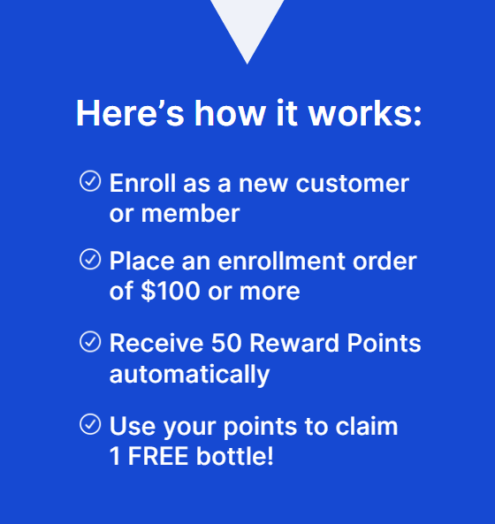 Purchase any TWO bottles on an initial order and get 50 Reward Points! That is enough to redeem 1 FREE bottle of your favorite product!