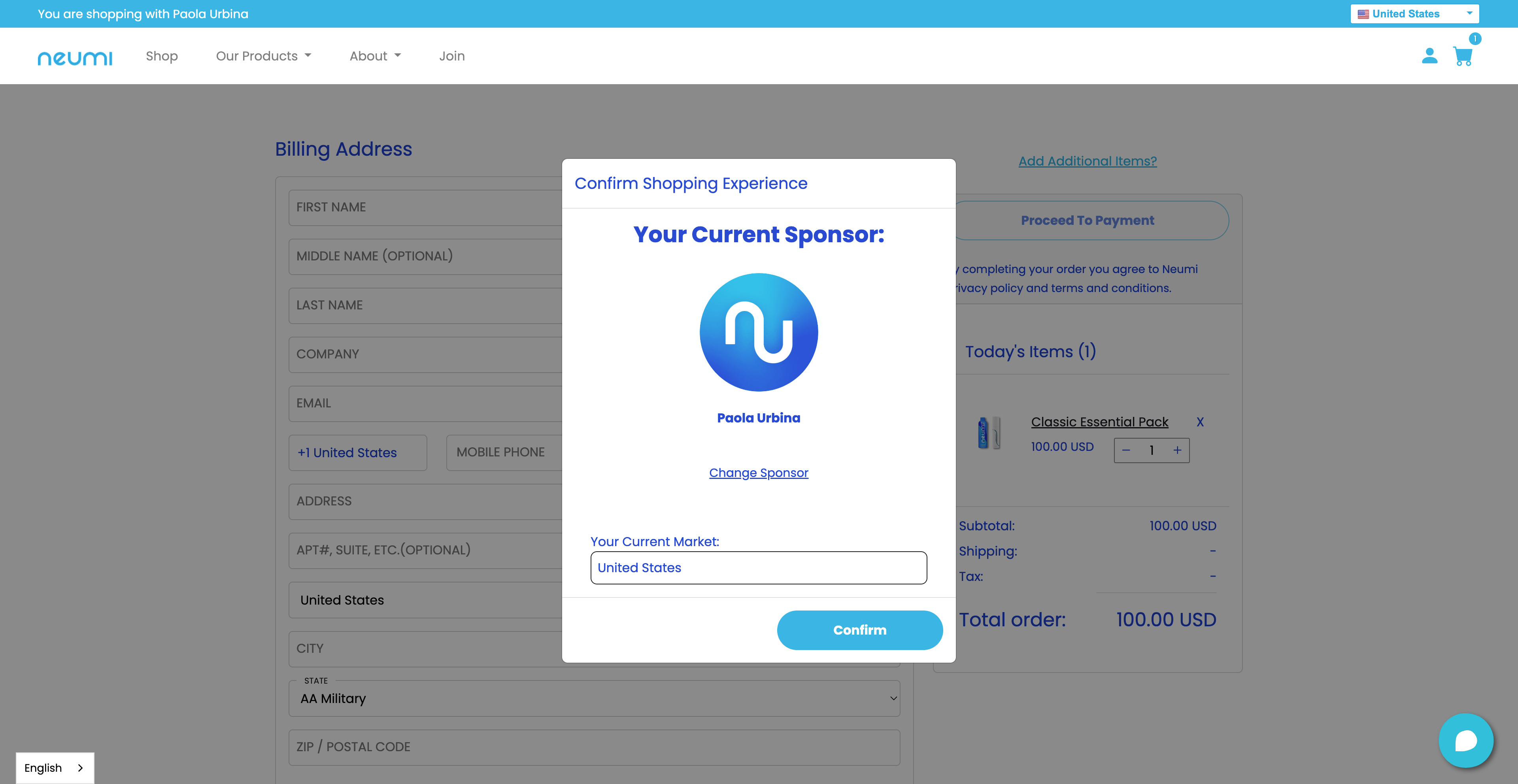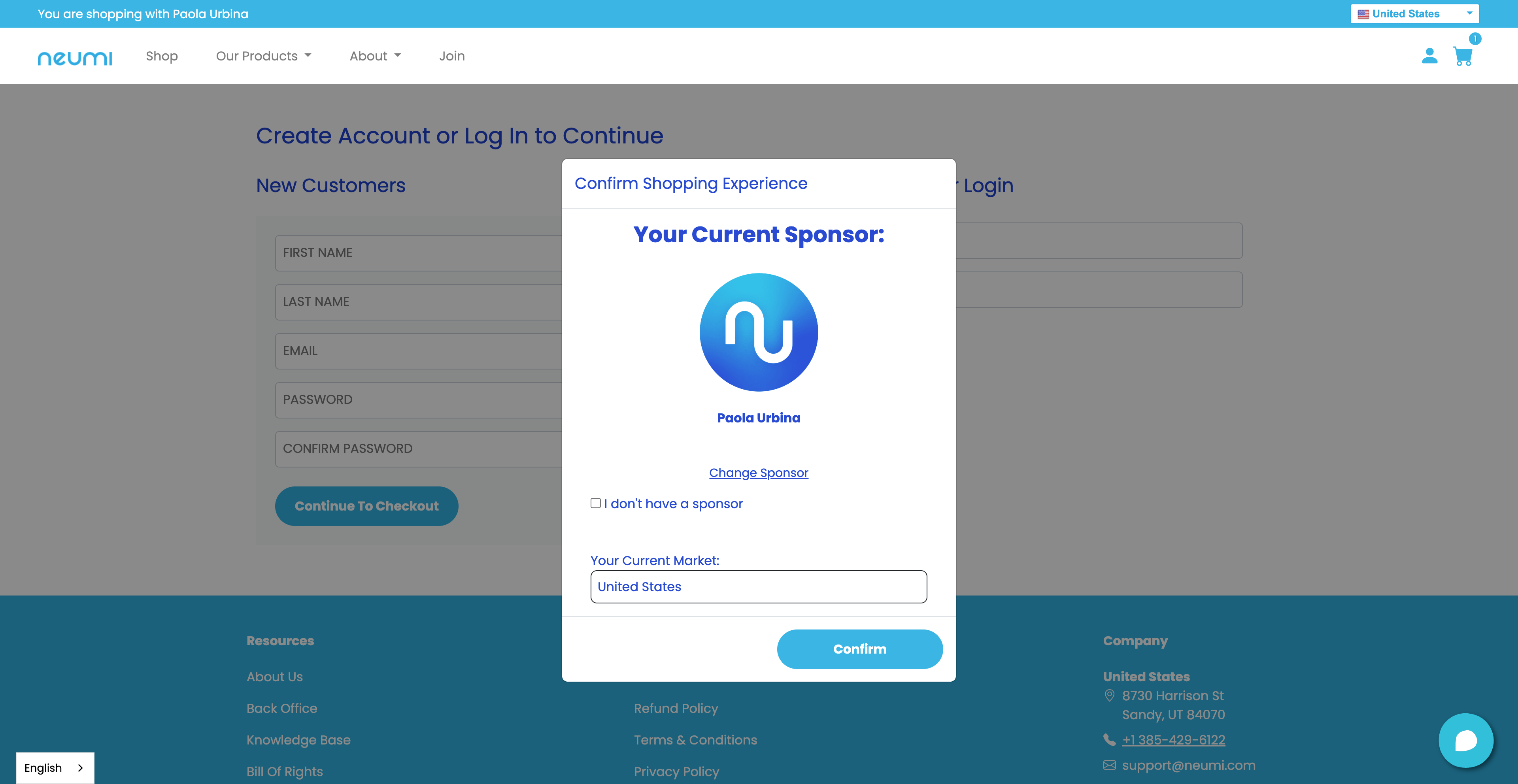 Member View (For members, you will be asked to confirm your Sponsor (enrolled) before choosing the product and before adding your shipping information).