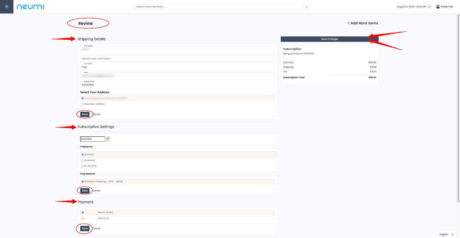 - “Review” is the final step for creating our auto-order. Before you save the changes, please double-check all the information on “Shipping Details,” “Subscription Settings”*, and “Payment.” Once you verify everything is correct, please go to your upper right-hand screen and click “Save Changes.”