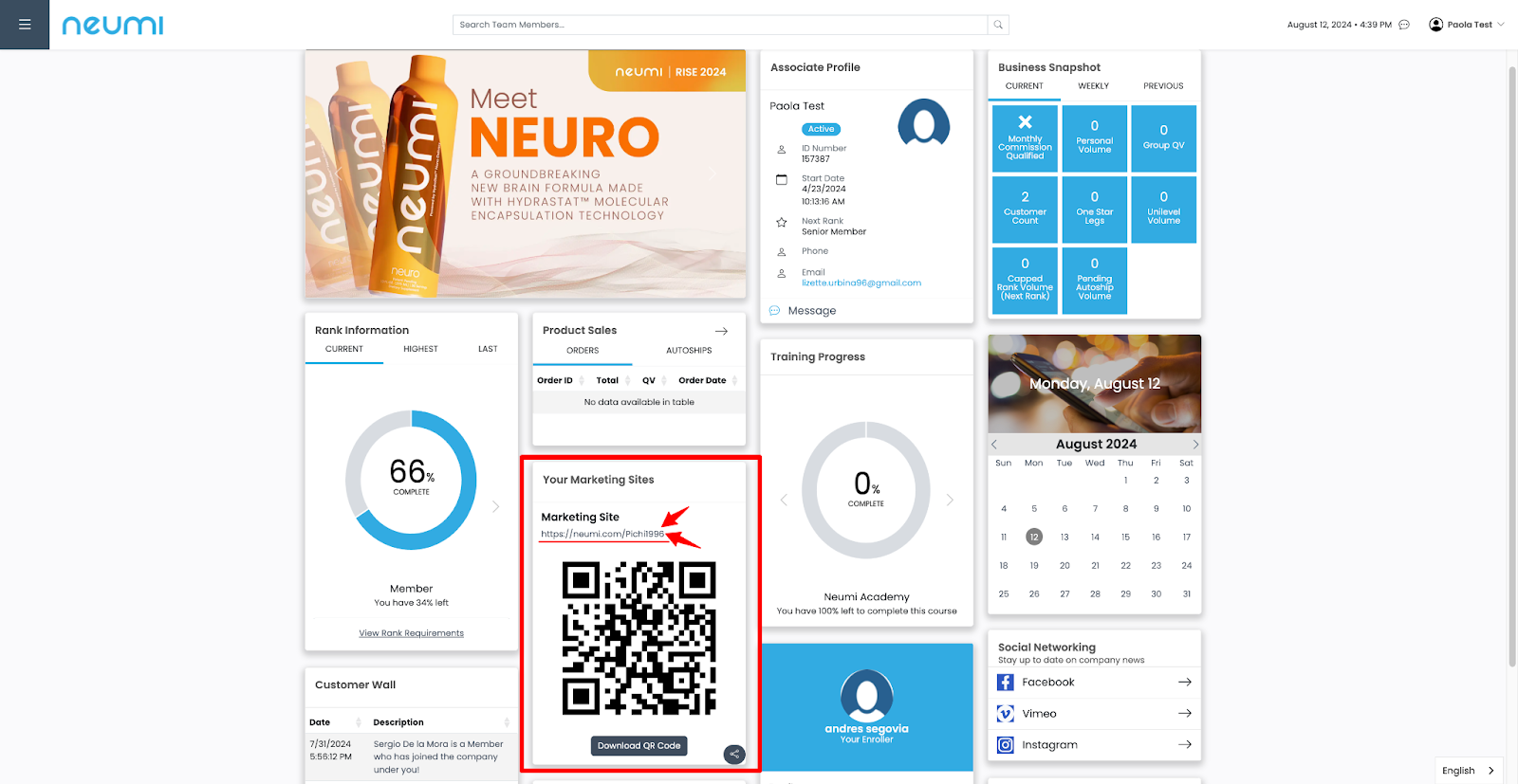 Click on your Marketing site link to be redirected to Neumi’s website.