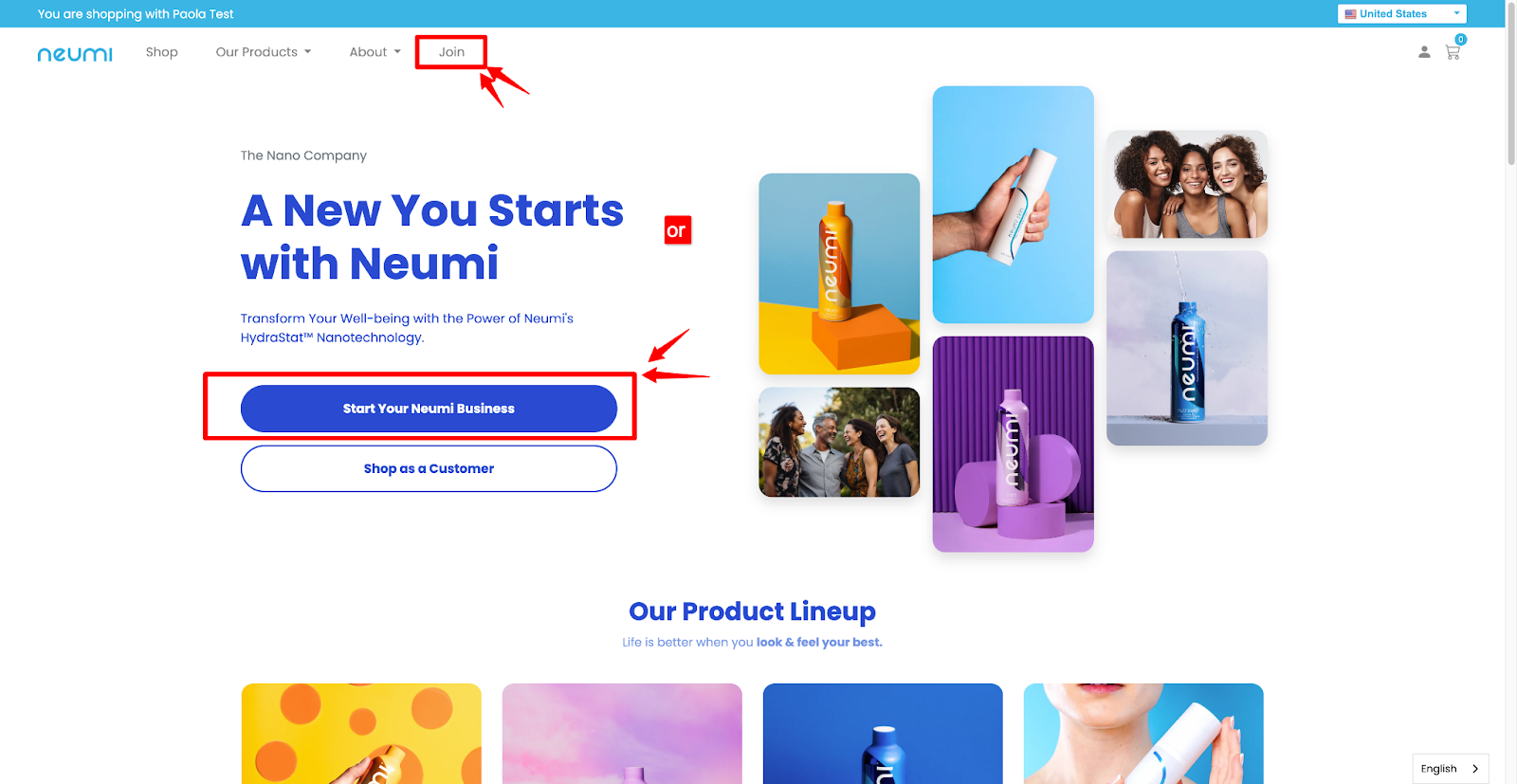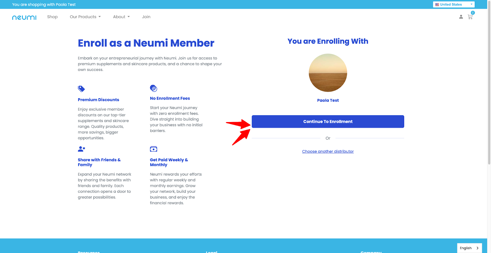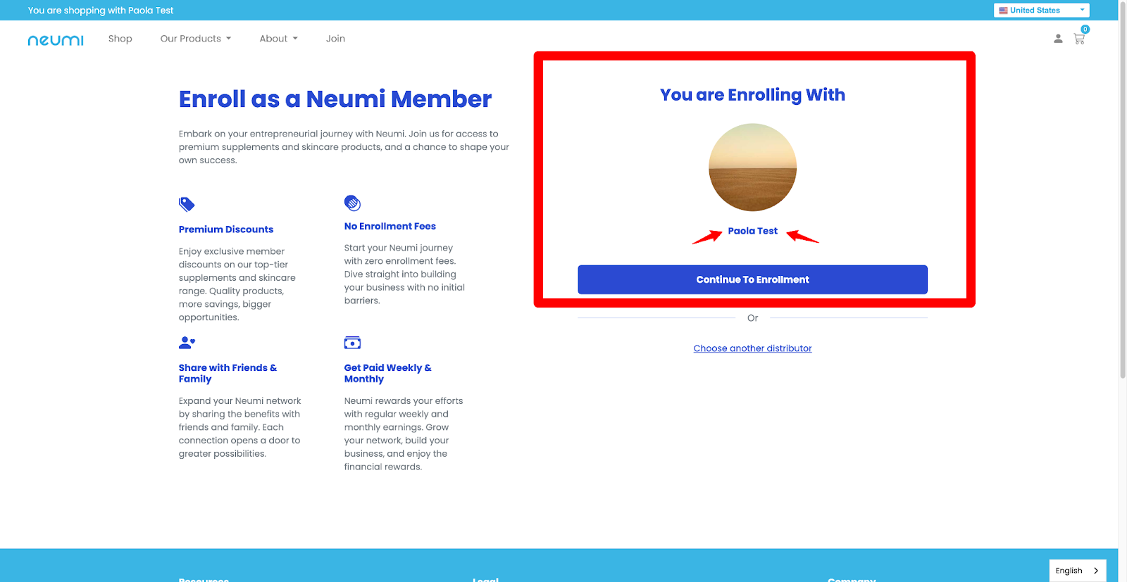 Once you’re in, please click where it says “Join” or “Start your Neumi Business,” and it will show a section that says, “You are enrolling with” (on this section, you, as a member, need to be sure that it says your name).