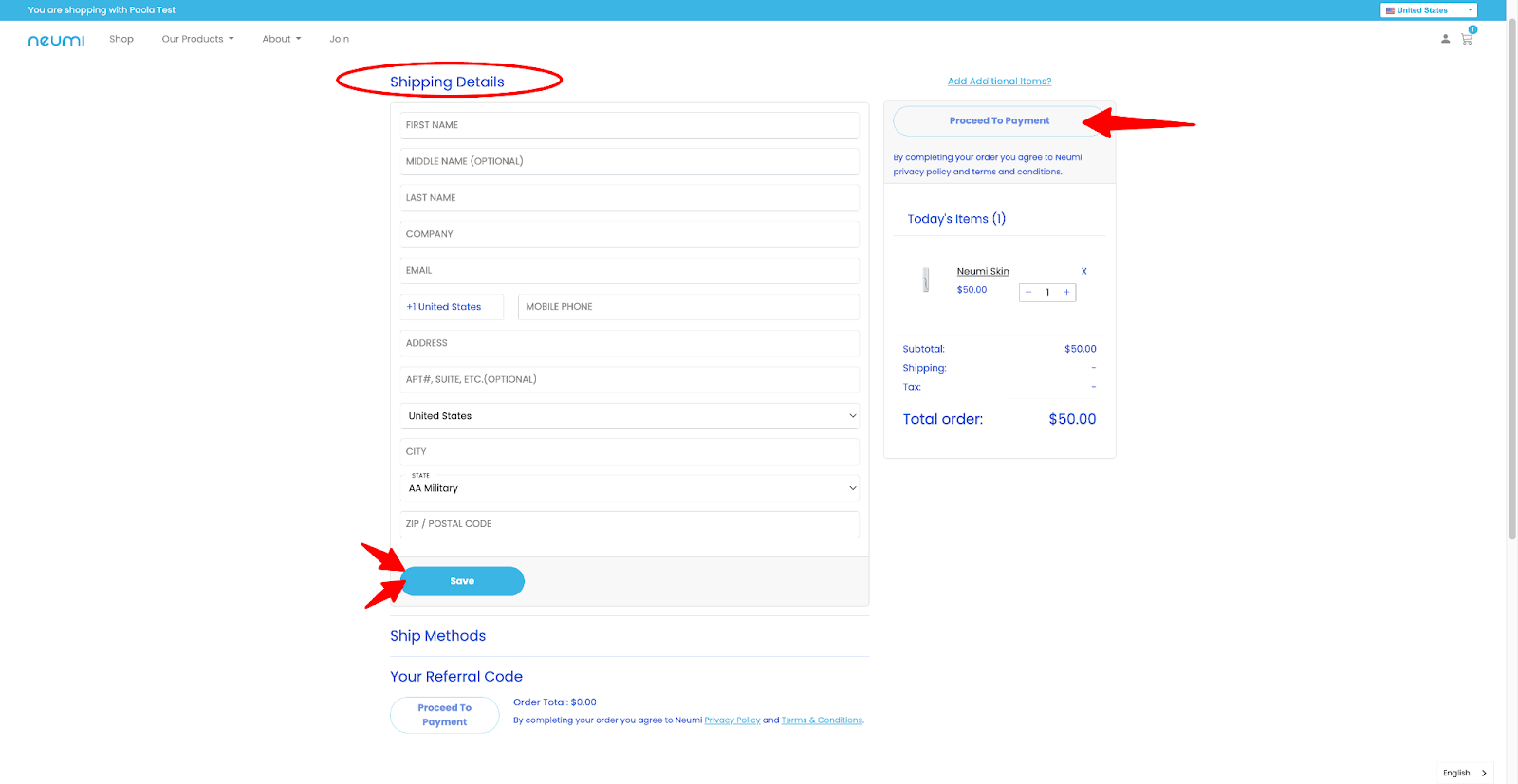 “Shipping details” is the final step in enrolling the person interested in the product. Please fill out all the sections with the information of the person who wants to become a member. In the section "Your Referral Code," you must enter the Web Alias your new customer wants to use. The same goes for the password(you will need to save the information in each section). Once you have finished everything, please click “Proceed to Payment”**.