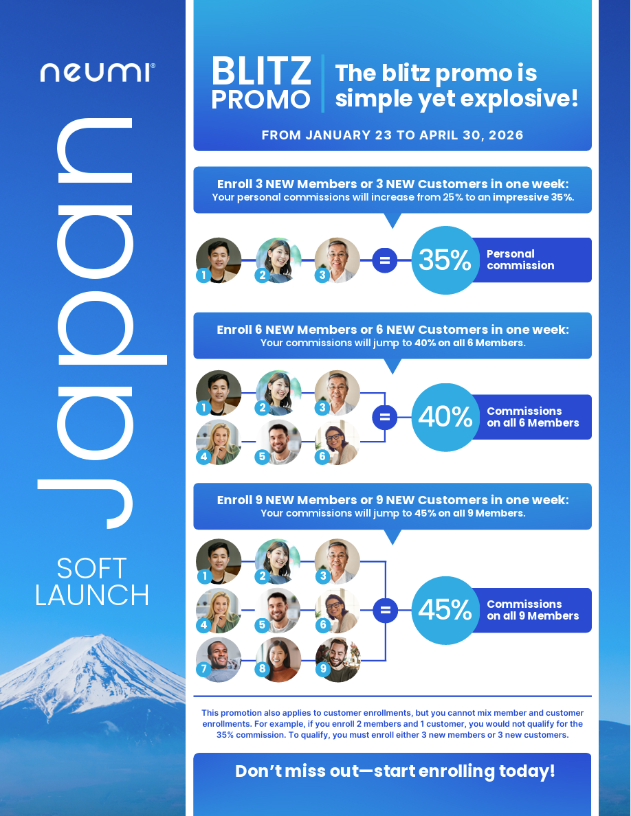 Our Japan Blitz Promo is an amazing opportunity to boost your weekly earnings and enroll new customers and/or members!